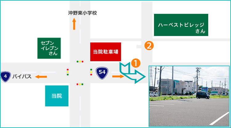 最初の横断歩道手前を左折していただくと当院の駐車場となります。